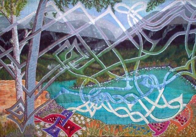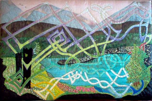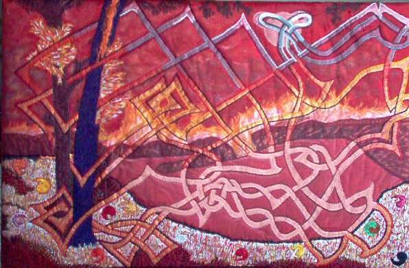 In this set, Cecile Jacobs uses sheers on top of cotton fabrics, Setacolor paint on fabric for the landscape details and Delta Ceramcoat Acrylic for the Celtic overlay. The apron of decomposition in the foreground of PROLIFERATION is created by the effects of a soldering iron upon black satin. |