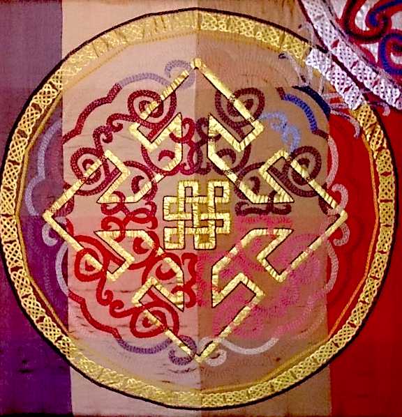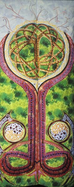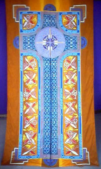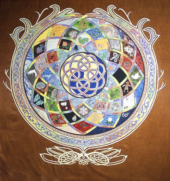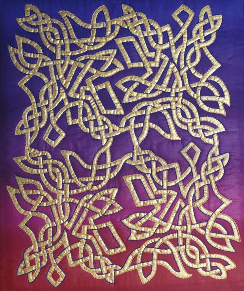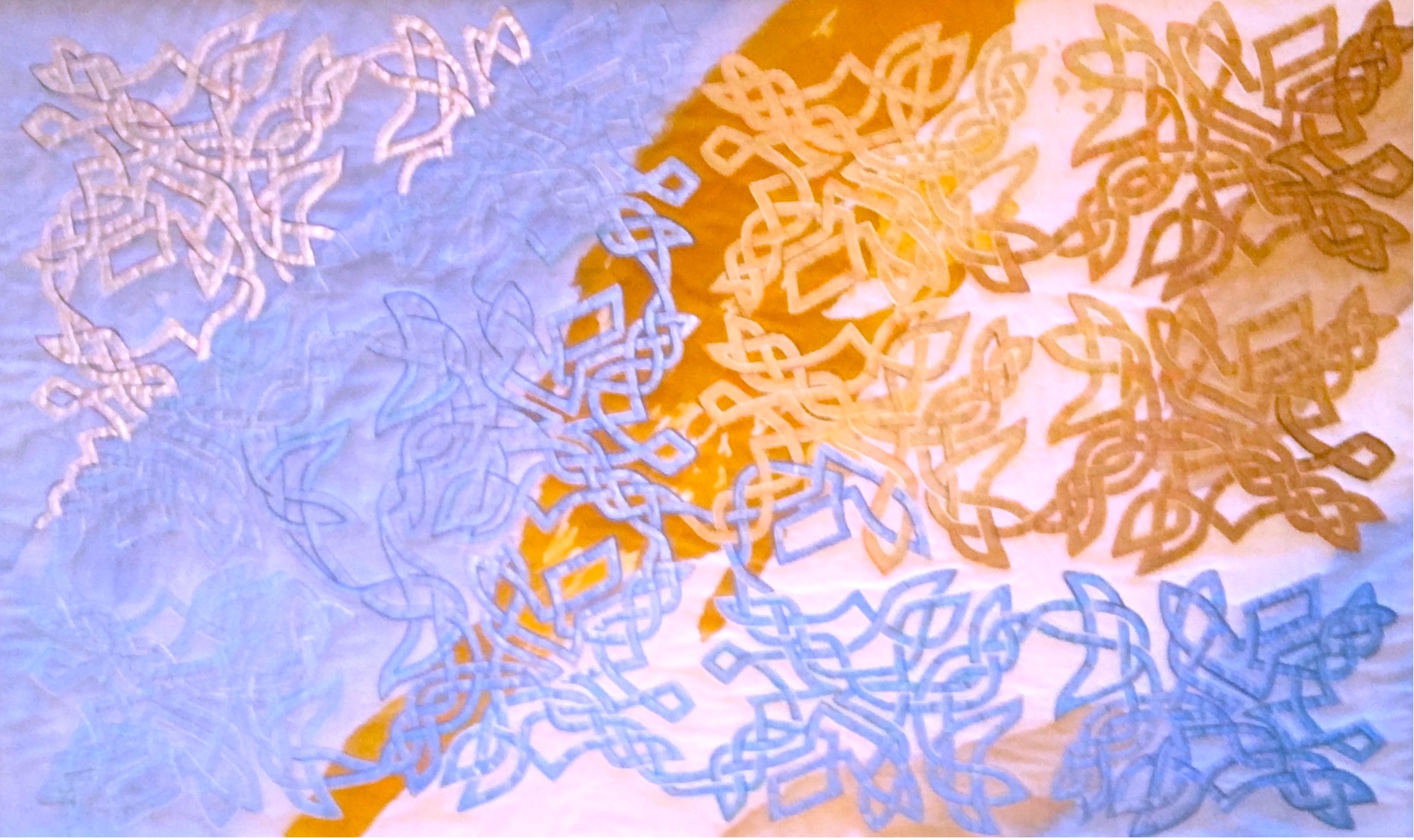 Cecile Jacobs works with acrylic paint/ dyes on fabric. Her Celtic designs are a blend of ancient and newly-created modern. She uses the ‘endless’ Celtic style to express recurrent philosophical, intellectual and spiritual themes: