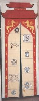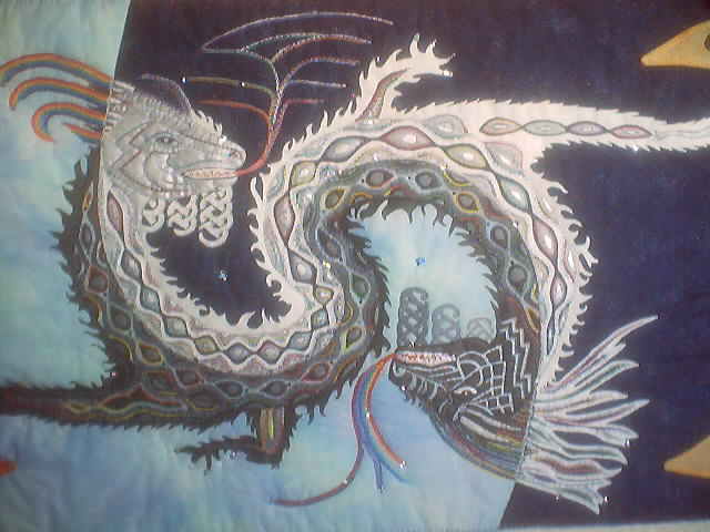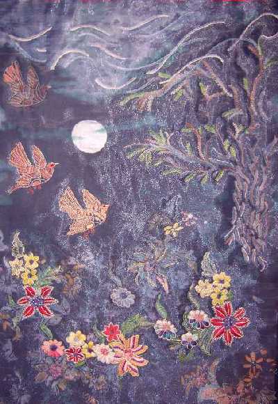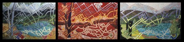 Cecile’s many massive wall-hangings are not intended simply as pretty pictures but as the medium for more complex ideas, messages and inspiration. They contain symbols of the positive power of Life, and have such titles as Spirit of Life, Endless Optimism. The central triptych - The Phoenix Cycle: Fire on the Mountain - shows the creative power of devastation. Life can be better than ever after devastation.
