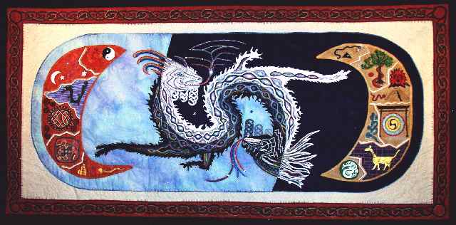 The dragon or serpent has always been the symbol of duality as is the Yin Yang. All elements of life have duality and can therefore be seen in at least two opposing ways. The bad/ negative things in life always contain elements of good/ positive and can be turned into good/ positive and vice versa. Life never remains the same, swinging from one extreme to the other, the ongoing swings and balances always to be borne in mind. Washable by hand.